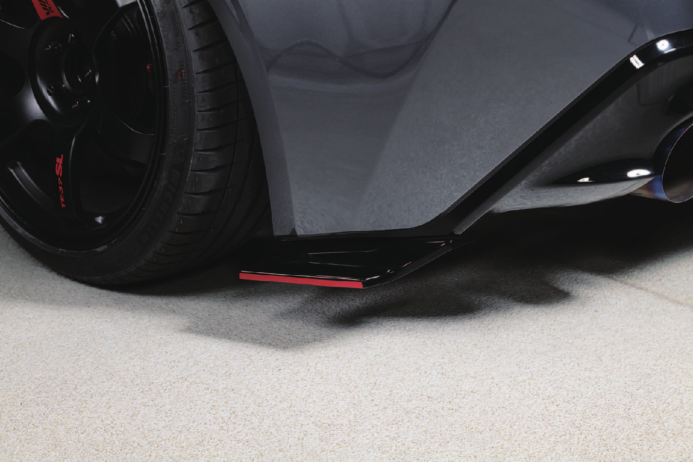 FRP製のエンドプレート。純正バンパーの視野にプラスするだけで、バンパー下部のフューザーのラインを延長したように見せられます。その効果は純正バンパーとは思えない迫力の見た目に演出できます。